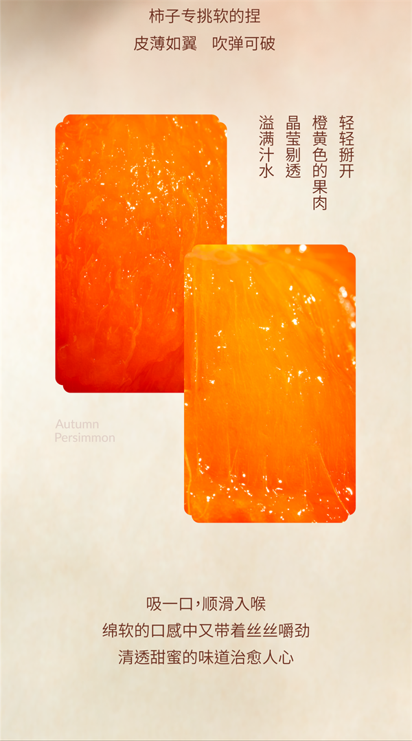 柿子专挑软的捏,皮薄如翼,吹弹可破,轻轻掰开,橙黄色的果肉晶莹剔透,溢满汁水